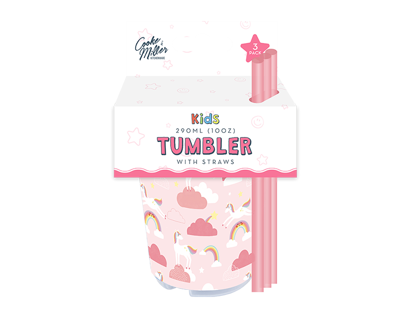 Each pack comes with 3 pink tumbler cups that are printed with a cute unicorn and rainbow design, each with a matching pink lid and straw.
