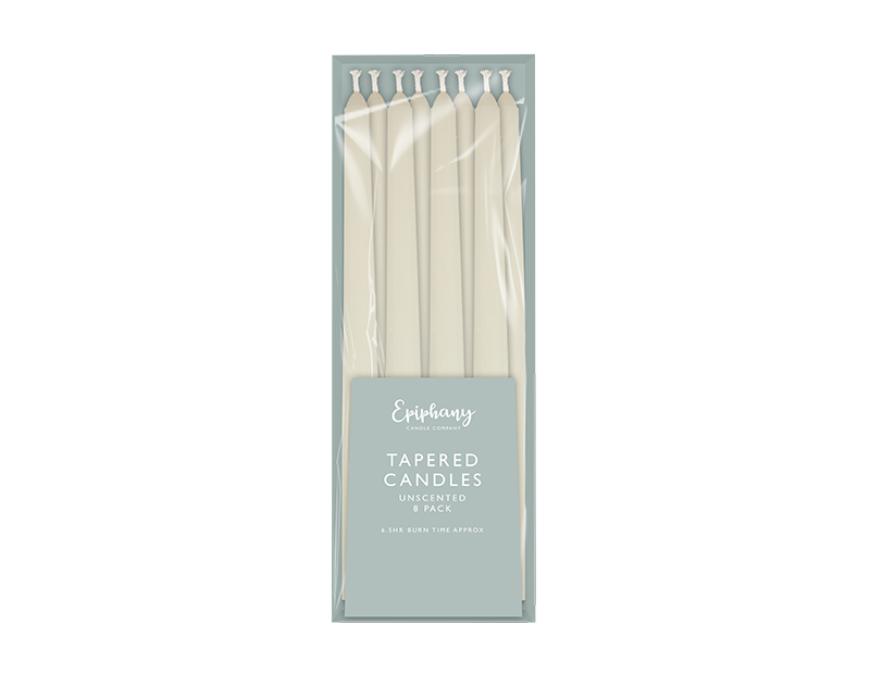 Each pack comes with eight individual candles that are unscented and measure L25cm x 2cm diameter. Each candle is a natural colour with a matching wick and has a 6.5 hour approx burn time.