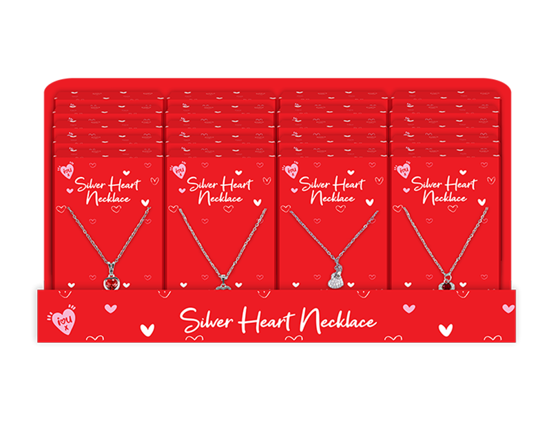 Each carton contains an assortment of four necklaces, each with a costume silver chain and one of four heart shaped charms. Each presented in an acetate box.