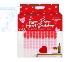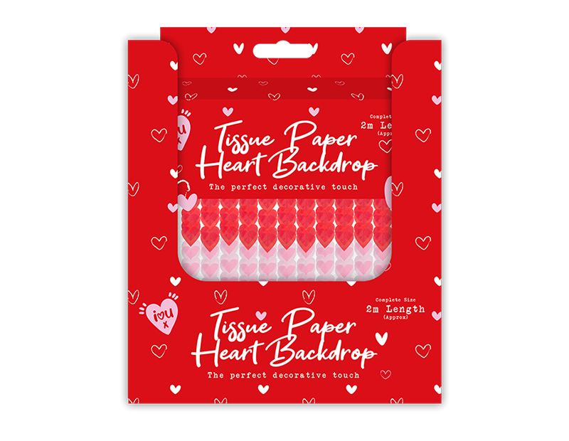 Each paper backdrop measures 2M long approx and features strings of tissue paper hearts in shades of red and pink.