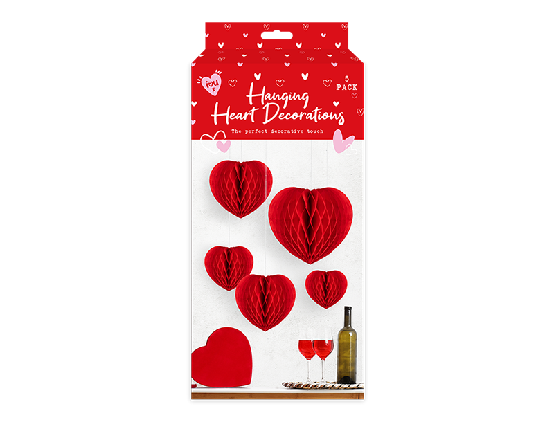 Each pack comes with five individual heart decorations, in assorted small, medium and large sizes, constructed from paper. Hanging twine comes pre-attached to the decorations, and includes 5 paper clips for hanging purposes.