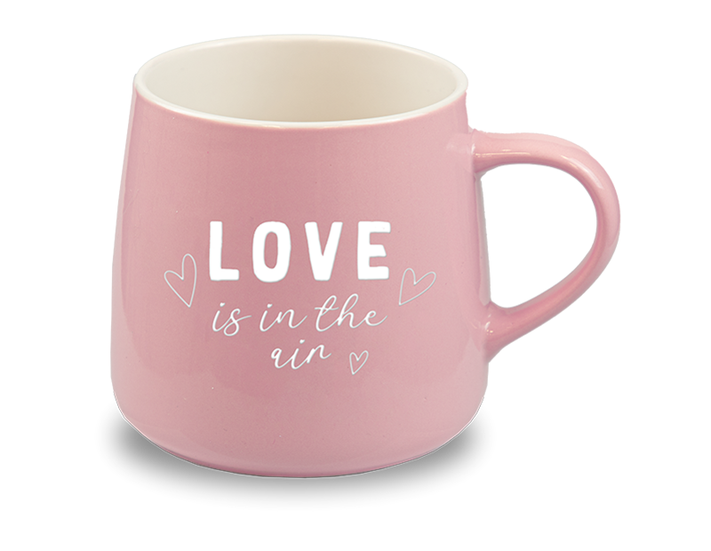 This beautiful ceramic mug comes in a pastel pink shade, engraved with the slogan 'Love is in the air' with a love heart design. Each mug measures H9.5cm x 10cm DIA.