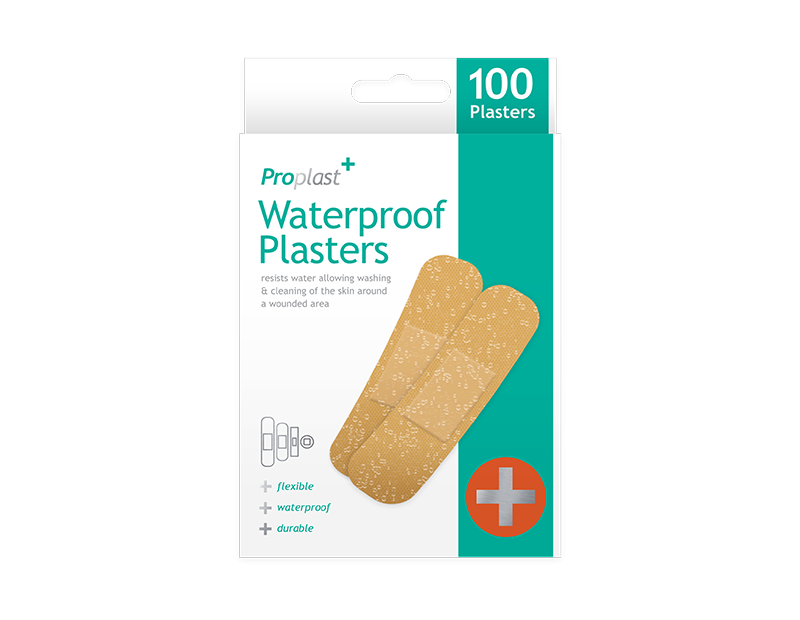 This pack of Waterproof Plasters contains one hundred individual plasters that are flexible, durable, and come in four assorted sizes per pack.