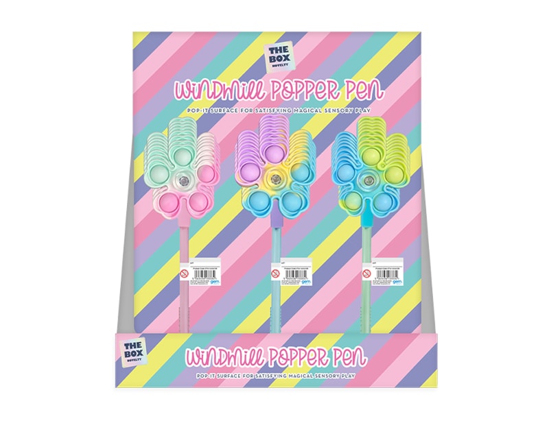The Windmill Popper Pen combines everyday writing with a built-in fidget element, featuring a flower-style windmill spinner mounted at the top of each pen. Supplied in an assortment of three ombre colourways-pink, green, and blue-each pen is finished with a five-petal windmill design, with heart-shaped petals that spin freely and include individual poppers. Writing in black ink, this format is well-suited to stationery and impulse ranges, offering clear visual appeal and interactive interest. Presented in a CDU, it’s easy to display, range, and replenish alongside other fidget stationery items.