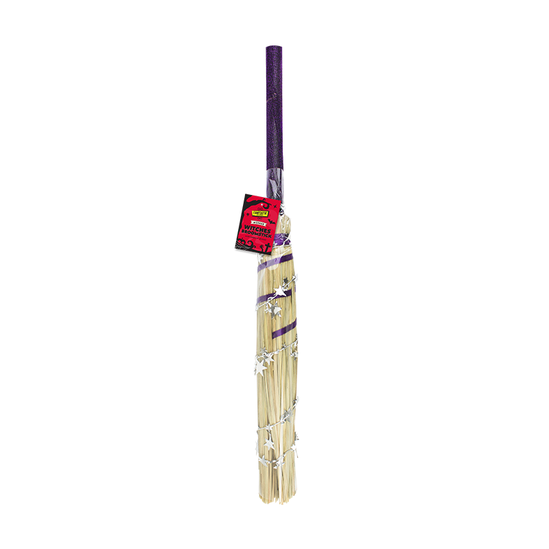 Witches' Halloween broomstick is the perfect prop to go with any witch's outfit. Each wooden broomstick handle is covered in a purple glittered fabric and features a natural straw broom end, decorated with purple ribbon and shiny silver stars.