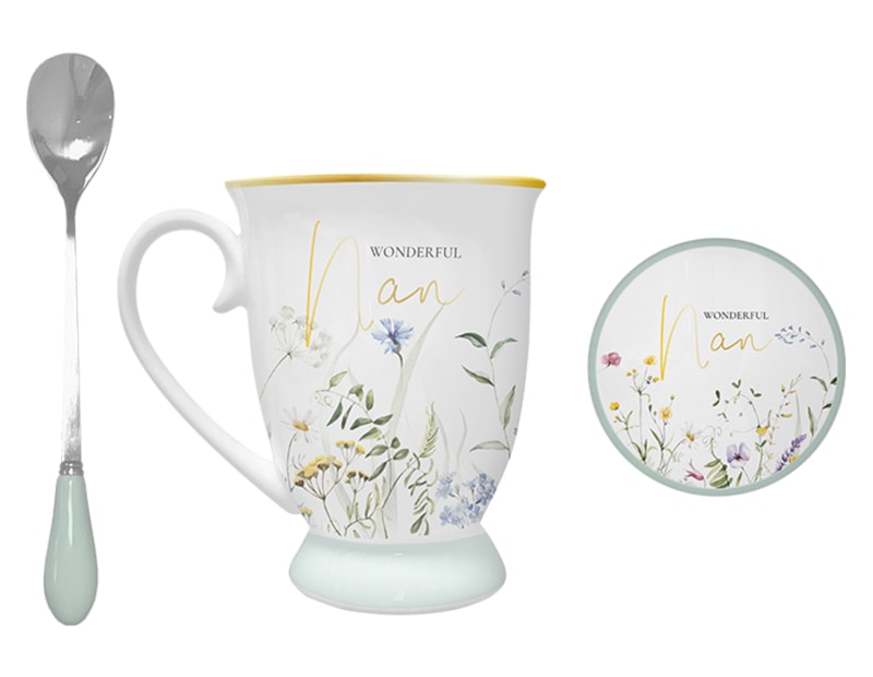 Each set comes with a cermaic mug and matching coaster, and a metal spoon, all with a floral surface print foil gold detailing, and quote reading 'wonderful nan'.
