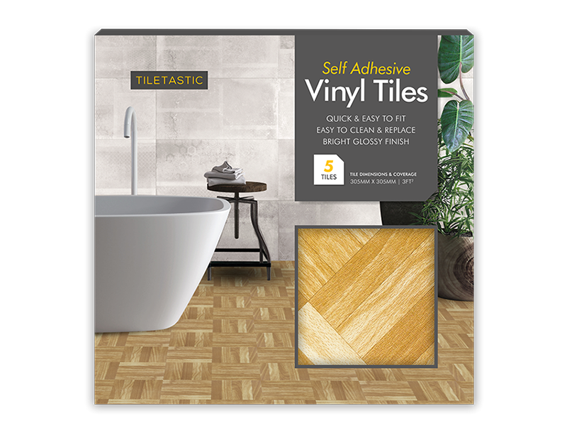 This pack of Self Adhesive Vinyl Floor Tiles contains five tiles that measure 30.5cm x 30.5cm with a 3 square foot total coverage.