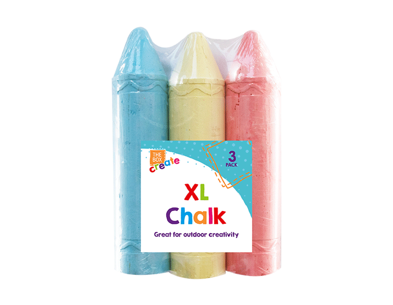 This pack of XL Chalk contains three pieces of chalk that measure a massive 19.5cm in length. The chalk is great for outdoor creativity and includes one blue, one yellow and one pink colour.