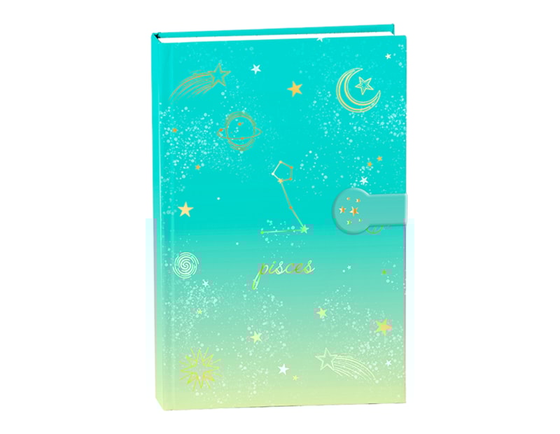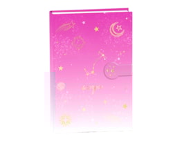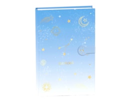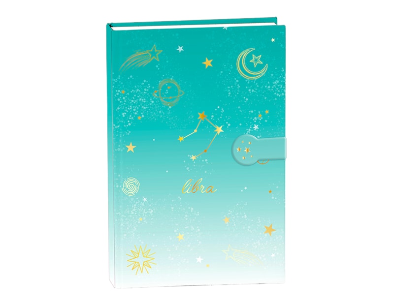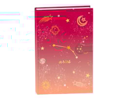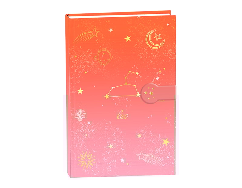 A stylish A5 hardback notebook, detailed with star sign, constellation and star, moon and planet print in a stunning gold foil, with a metallic strap close.