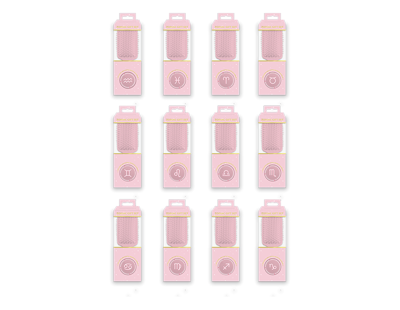 Each gift set includes paddle hair brush and matching compact mirror with zodiac print design.